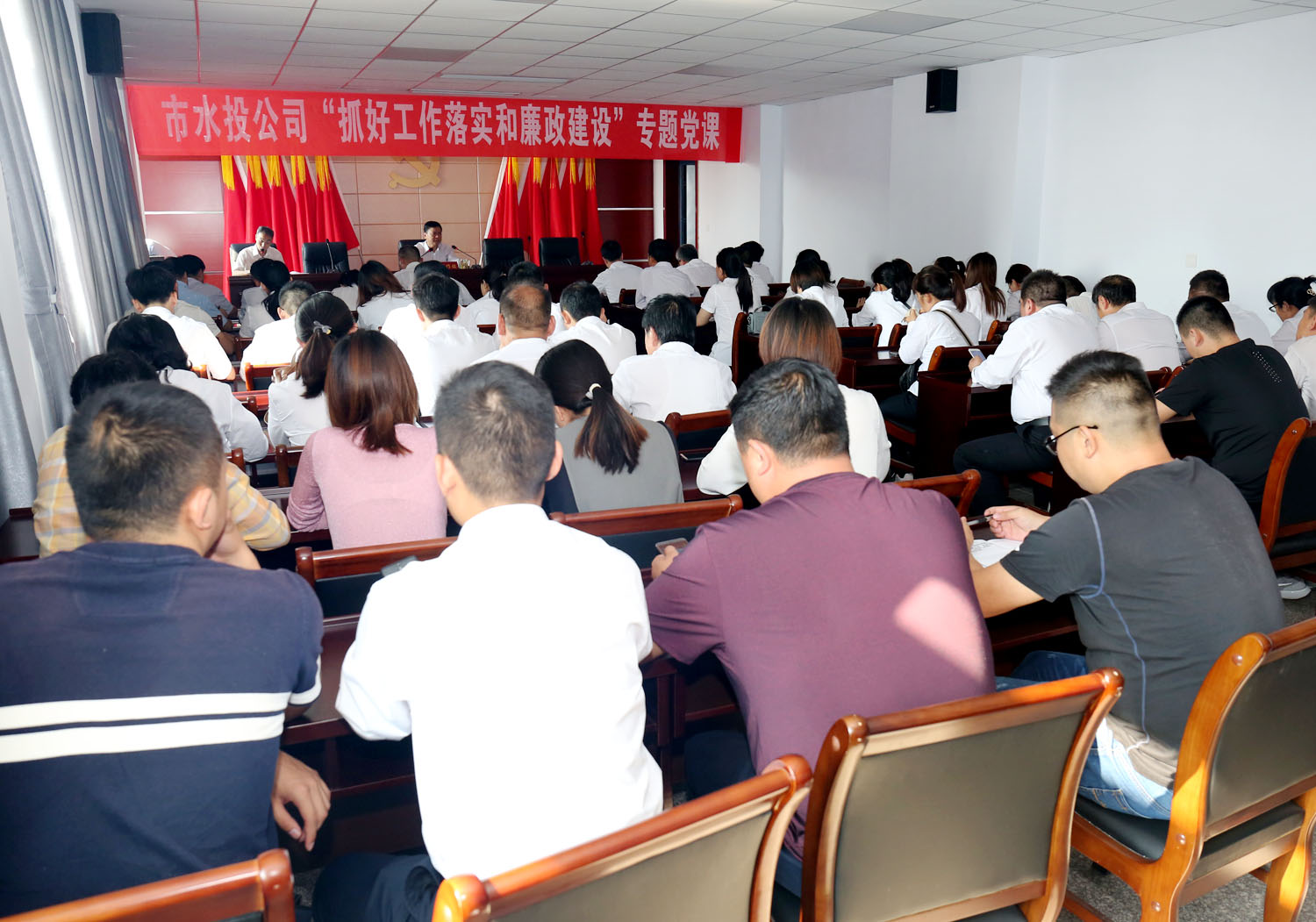 為深入推進(jìn)“不忘初心、牢記使命”主題教育活動開展,按照市委統(tǒng)一部署安排,經(jīng)公司黨委研究決定,于9月29日下午在公司六樓會議室,黨委書記崔作銘為公司全體黨員講了一堂題為“抓好工作落實和廉政建設(shè)”的專題黨課。公司各黨(總)支部全體黨員到場聽講。