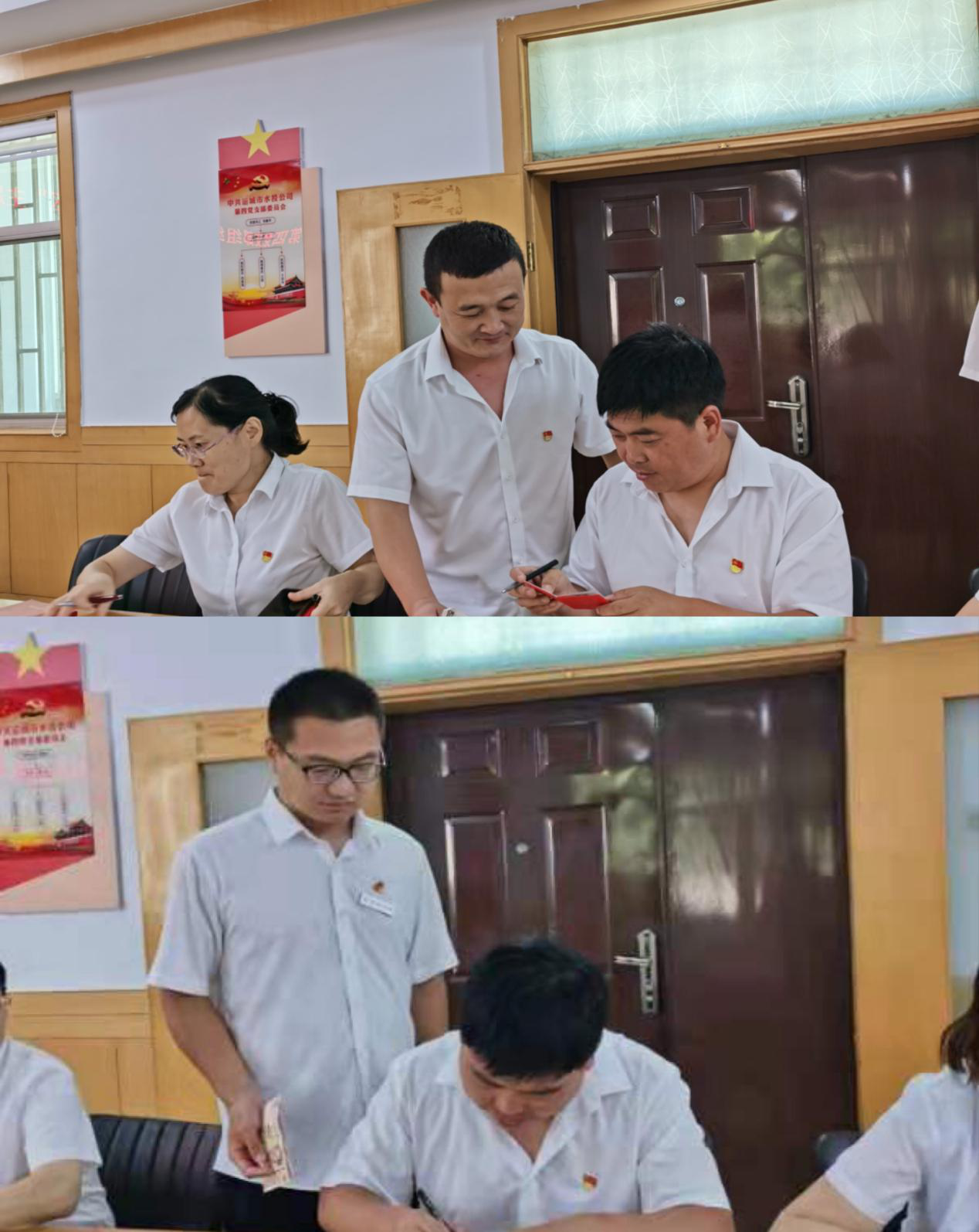 首先,全體黨員逐個(gè)向支部繳納了本月黨費(fèi),并進(jìn)行了黨費(fèi)收繳臺(tái)賬登記。