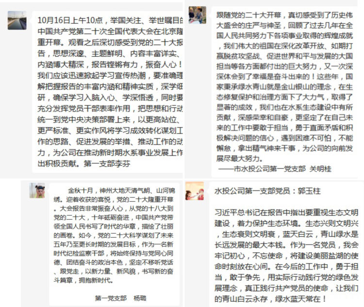 習近平總書記的報告中指明了生態(tài)文明建設的重要意義,特別強調(diào)了要“推動綠色發(fā)展,促進人與自然和諧共生”,令人振奮、催人奮進,大家紛紛感言,要把黨的二十大精神作為當前和今后一項重要政治任務,要學以致用,立足本職崗位,突出工作重點,用黨的二十大精神指導實踐,做好中心城區(qū)重點水系項目推進工作,推進黑臭水體治理,強化水質(zhì)提升,解決城區(qū)排澇問題,把黨的二十大精神轉(zhuǎn)化為推進公司發(fā)展的強大動力和生動實踐,努力在新時代新征程上展現(xiàn)新氣象新作為。
