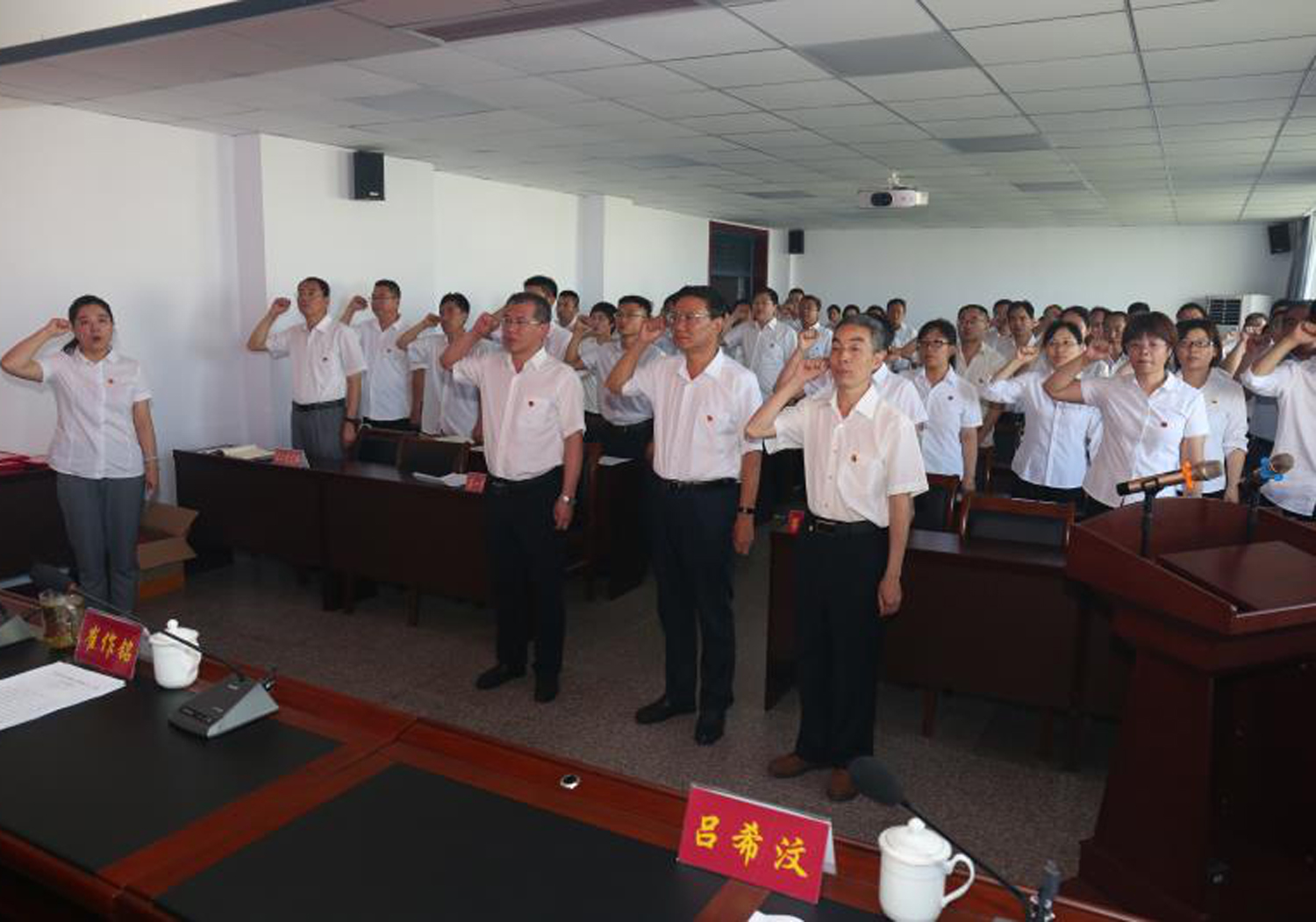 大會在雄壯的國歌聲中拉開帷幕,黨委辦公室主任郝麗娜同志領誓,全體黨員面對黨旗,共同重溫了入黨誓詞。